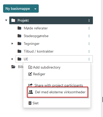 Vælg på den dokumentmappe, som den eksterne bruger skal have adgang til. Klik på de tre prikker ud for mappen og tryk på 'Del med eksterne virksomheder'.