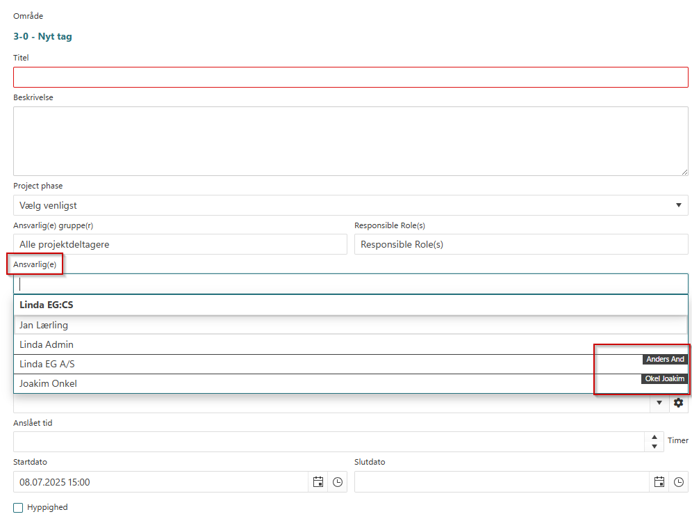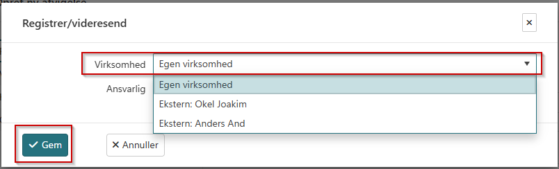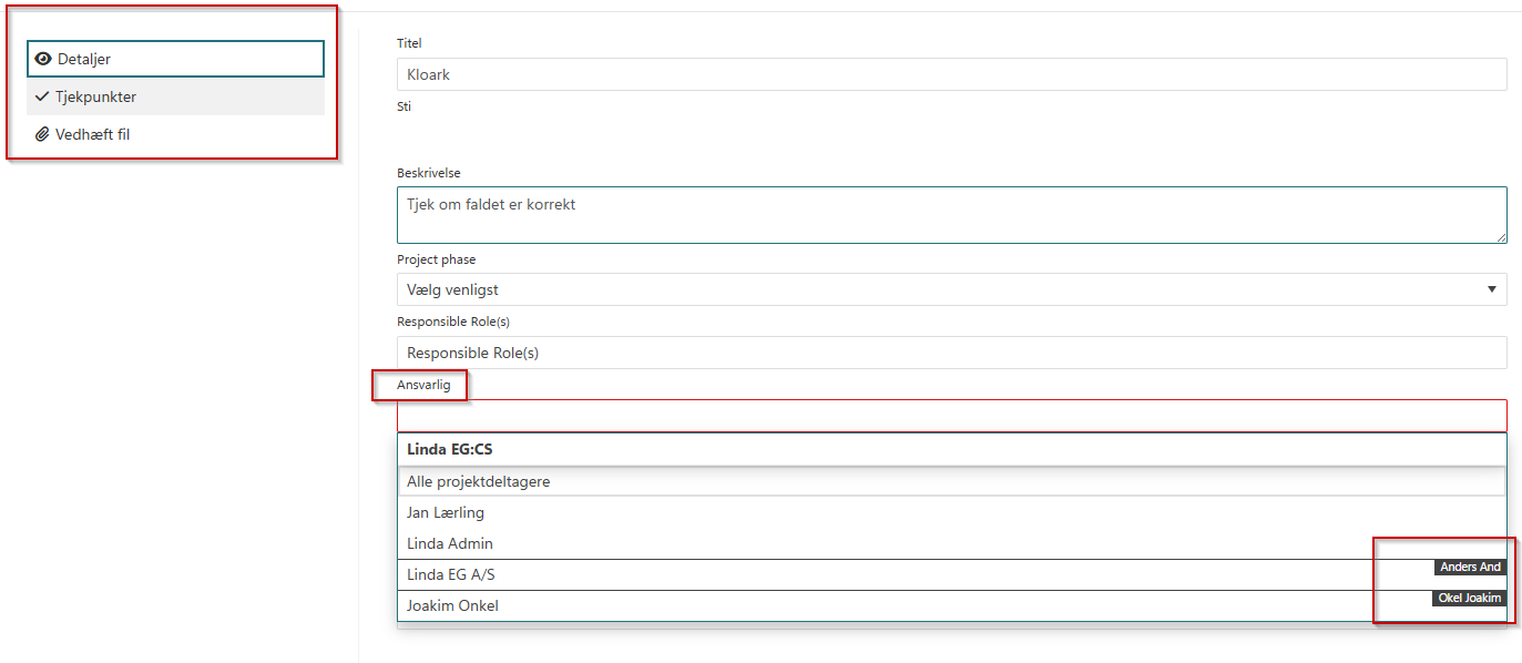Her kan du vælge hvem der skal være ansvarlig for opgaven – Er det en intern eller ekstern bruger. De eksterne brugere står der et firmanavn ved, ude til højre for navnet.