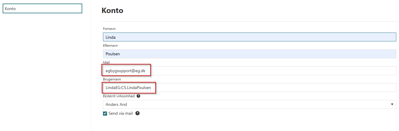 Du må gerne ændre mailen i feltet Mail, hvis den forkerte mail står der, men man må IKKE ændre i feltet Brugernavn.