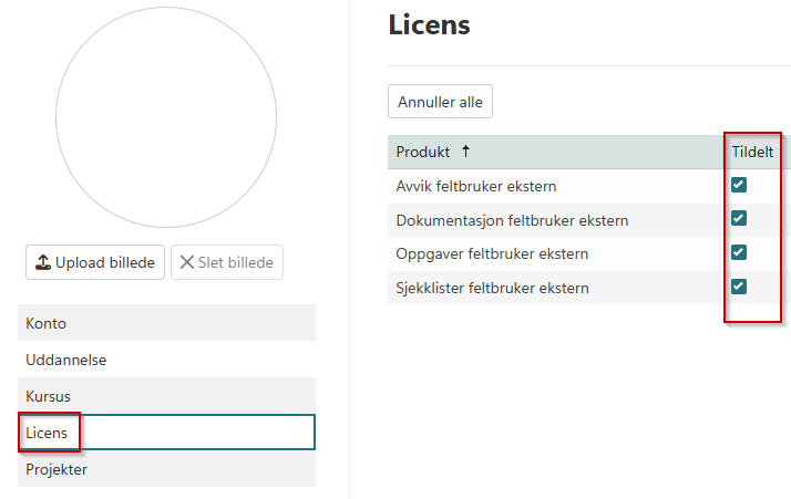 Du kan definere hvad den enkelte bruger skal have adgang til, ed at klikke på Licens i menuen.