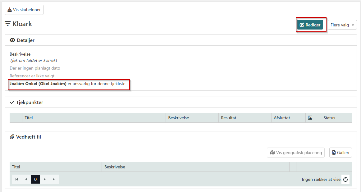 Hvis man ønsker at en anden skal være ansvarlig for tjeklisten, klikkes på rediger og man kan ændre navnet.