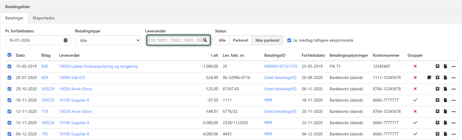 Tidligere var det kun muligt at eksportere cirka 80 betalinger pr. gang, og det var ikke altid muligt at fravælge en enkelt leverandør i leverandørfilteret. Dette er nu rettet.