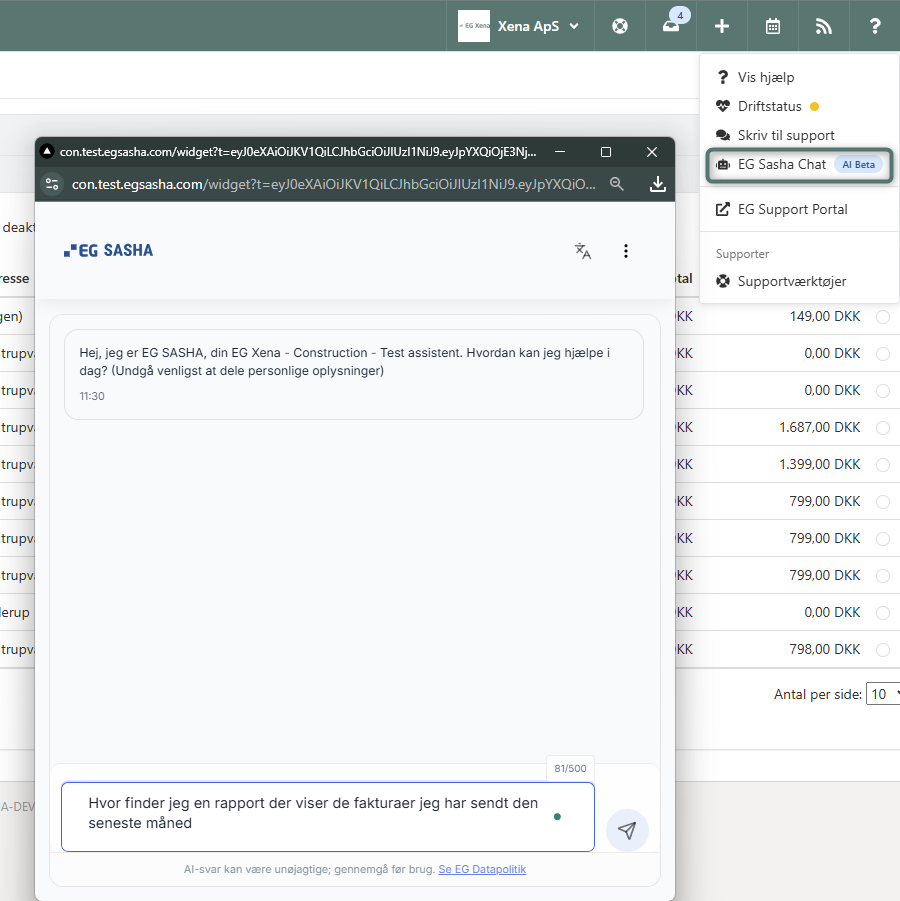Vi har tilføjet en ny og nem måde at få hjælp i Xena på. Fremover kan du bruge EG Sasha – vores nye chatbot – som giver dig hurtig vejledning direkte i systemet.